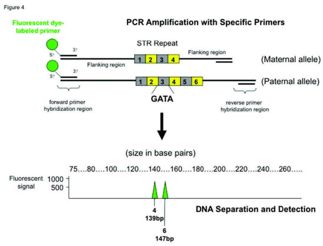 In Figure 4 above, the primers define the locus to be amplified or copied, by binding to the flanking regions on either side. During copying the fluorescently labelled primer is incorporated into the copied DNA. The paternal allele has six repeating units and is therefore longer than the maternal allele with only four units. These two alleles can be separated using capillary electrophoresis on the basis of their different lengths as shown at the bottom. To detect the DNA, a laser beam excites the fluorescent tag on the DNA, enabling a charge coupled device (ccd) camera...